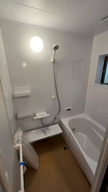 浴室の改修にあたっては、既存の構造に合わせたユニットバスの選定を行い、限られたスペースでも広く感じられるよう配慮しました。壁面には収納棚を設置し、使い勝手を向上。床材には滑りにくい素材を採用し、安全性にも配慮しています。給湯器の交換では、屋外設置型の本体を保護柵で囲い、外部からの衝撃やいたずらを防止。室内の操作パネルは見やすい位置に設置し、温度調整が直感的に行えるよう工夫しました。施工中は、既存設備の撤去から新設までをスムーズに進めるため、事前の配管確認や電源位置の調整も丁寧に行いました。